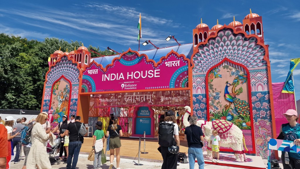 The India Pavilion, unique in the history of the games, is a vibrant showcase of India’s cultural heritage, visible from across the park. My entry was seamless, thanks to pre-booked tickets, and I was immediately struck by the volunteers in their beautifully designed kurtas, reflecting centuries-old Indian motifs once admired by the Royals of Versailles. These volunteers, exuding grace and style, set the tone for what was to come.