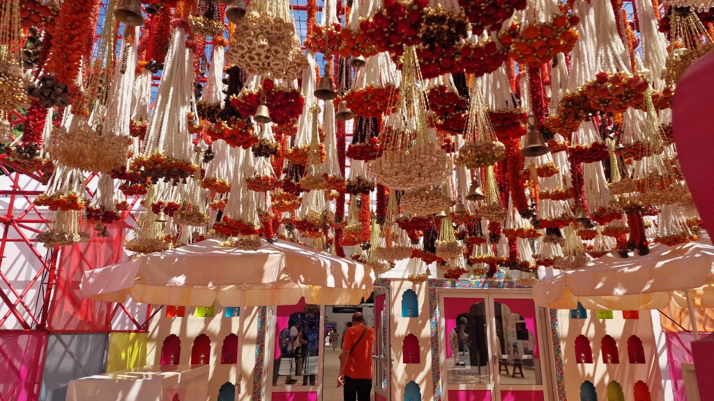The pavilion’s entrance is nothing short of royal, with elephants on either side and flower hangings (jhalars) creating a canopy that evokes a traditional mandap. Inside, I was greeted by a dapper volunteer whose style could rival any Bollywood star—a reminder that the essence of India lies in its people.