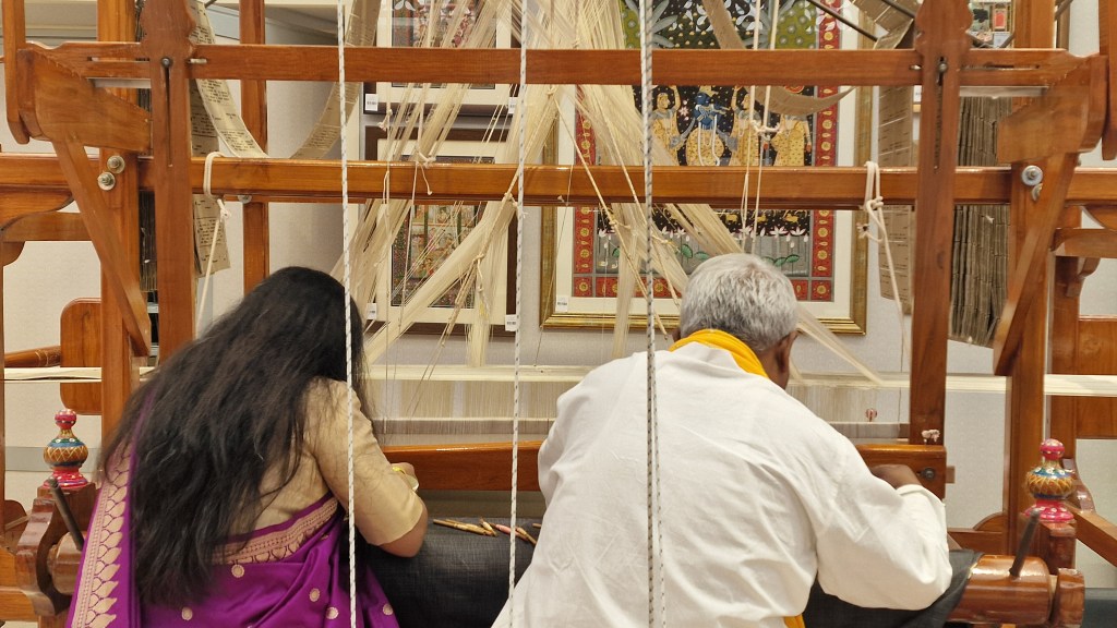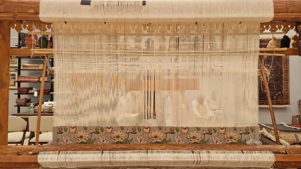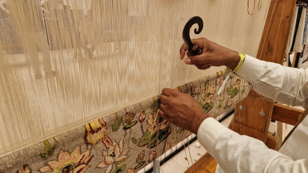 What stands out is the handloom experience brought from India. In one section, I can see weavers weaving sarees, and in another, karigars knotting carpets. The technical aspect of carpet weaving is fascinating: threads hang from a lateral bar and are connected one by one towards the lower slide.